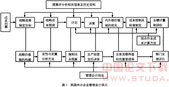 我国中小企业管理会计模式要基于各种因素,建立以实现战略成本为目标、综合运用作业成本法和价值链分析法来改善管理会计实施环境、优化企业战略管理、提高中小企业竞争力的模式体系。