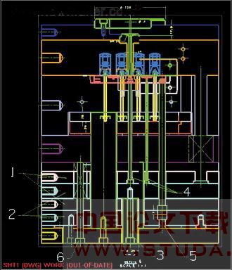 1.A板 2.B板 3.推板 4.推板 5.顶针板 6.顶针托板